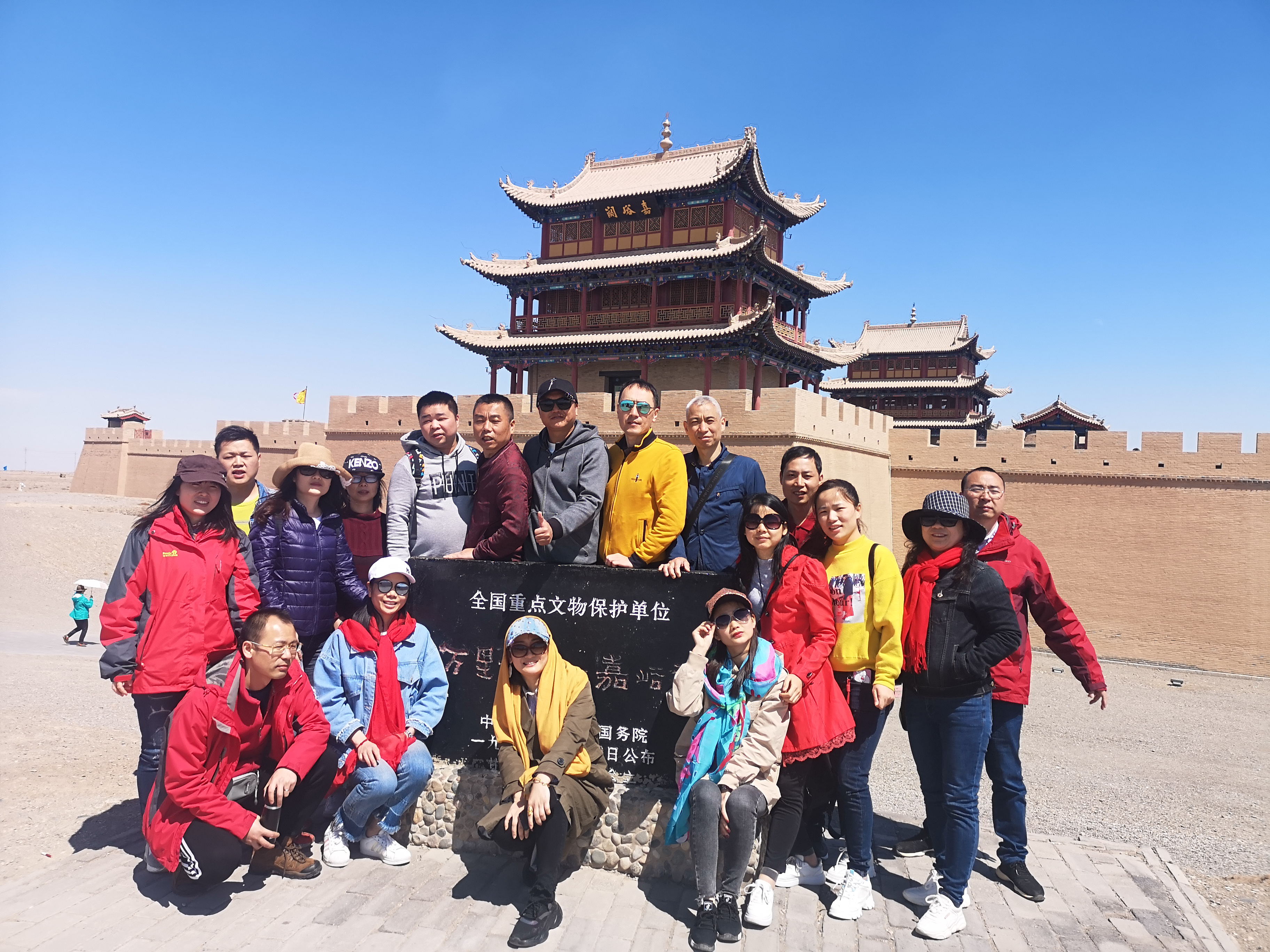 隨后來到此次旅行的第五站:嘉峪關城樓-----天下第一雄關。“雄關漫道真如鐵,而今邁步從頭越!”“不到長城非好漢”!一到雄關,這些名言立即脫口而出。雄偉的萬里長城,是中華民族的瑰寶!是中華民族歷史的見證!東起山海關,西至嘉峪關,氣勢磅砣!它的雄偉、厚重的歷史氣息讓我們震撼,扶摸著城墻,觸摸著兩千年的歷史,心中波瀾壯闊。登上城樓,由垛口向外看,不同的方向可以看到不同的景致——雪山、戈壁、房屋、內城、外城和城壕、手持旌旗,還真有一夫當關、萬夫莫敵的英雄氣概;但使龍城飛將在,不教胡馬度陰山。