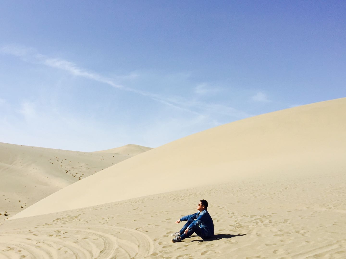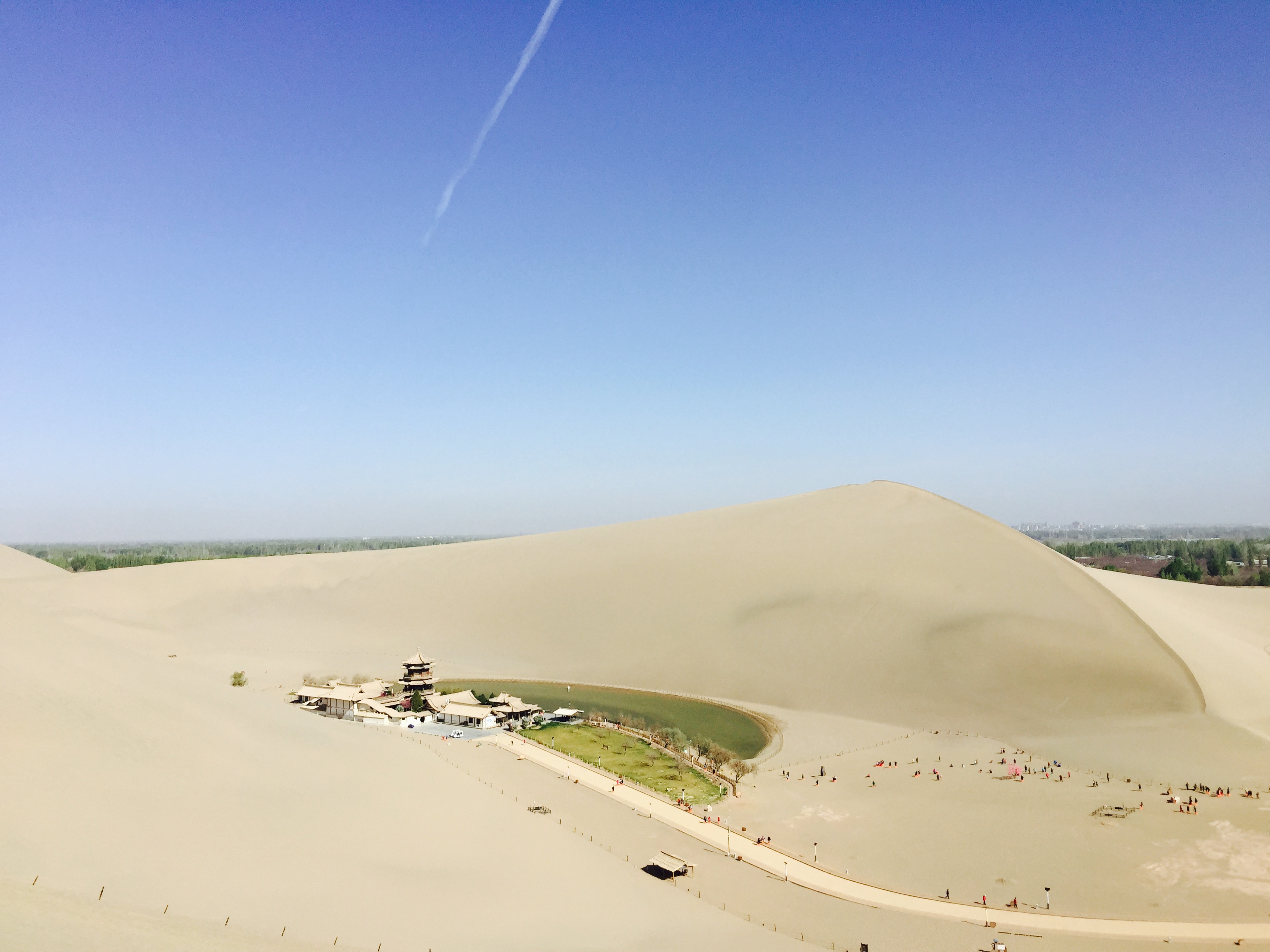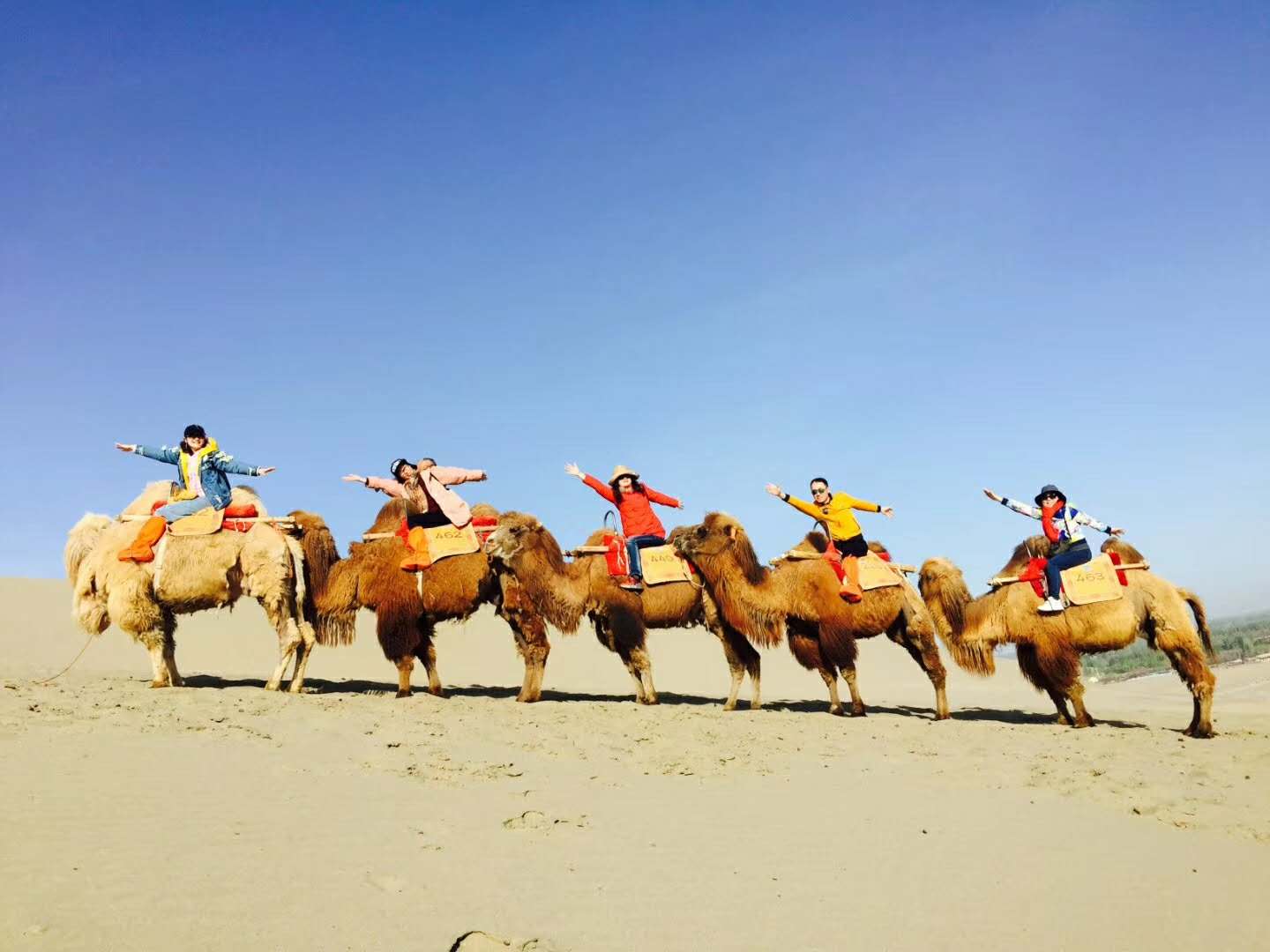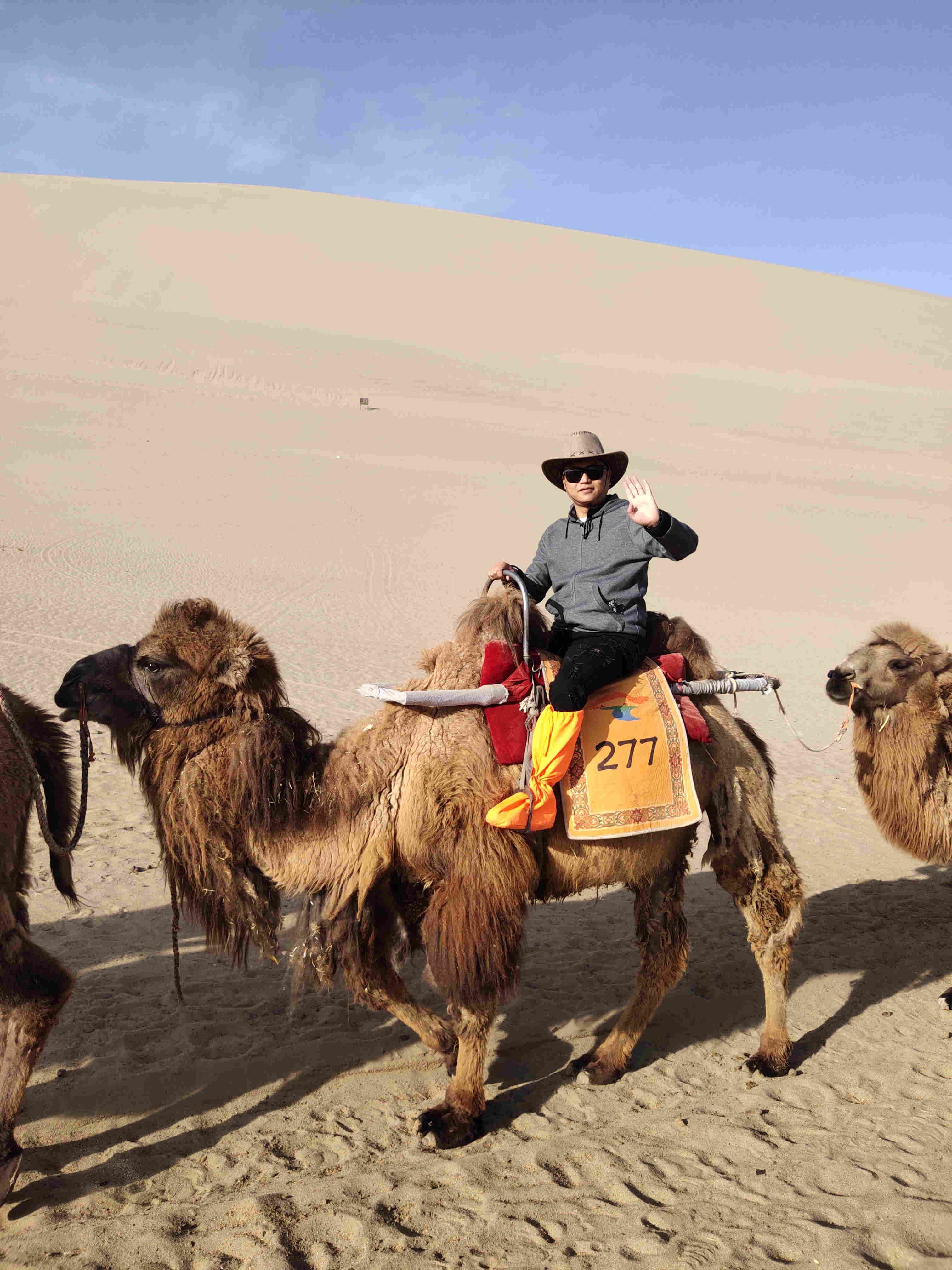 第五天早餐后乘車前往第六站:游覽鳴沙山月牙泉。鳴沙山位于敦煌市南6公里的沙鳴山北麓,在狂風怒吼時,沙山會發(fā)出巨大的響聲,輕風吹拂時,聲音又似管弦絲竹,故名“鳴沙山”。歷來水火不能相容,沙漠清泉難以共存,但在鳴沙山中,卻能看到沙漠與清泉相伴為鄰的奇景。月牙泉被鳴沙山環(huán)抱,長約150m,寬約50m,因水面酷似一彎新月而得名,這是鳴沙山景區(qū)最著名的地方,充滿了色彩和生機,宛如大漠羌笛聲中的一段江南牧笛聲,婉轉清揚,歡快靈動。面對連綿的沙山,我們大伙迫不及待想深入其中,沿著古人的步履,也蹣跚一下幾千年前誕生的這燦爛文明的絲綢之路。我們綁好鞋套,圍好紗巾,騎上駱駝,便開始了沙漠之旅,一路上聽著《月牙泉》,欣賞著壯美的大漠風光。
