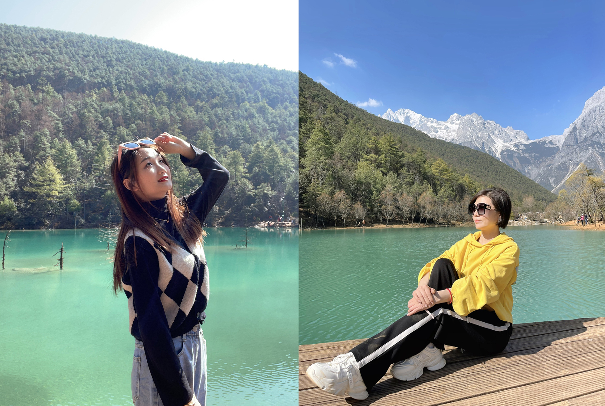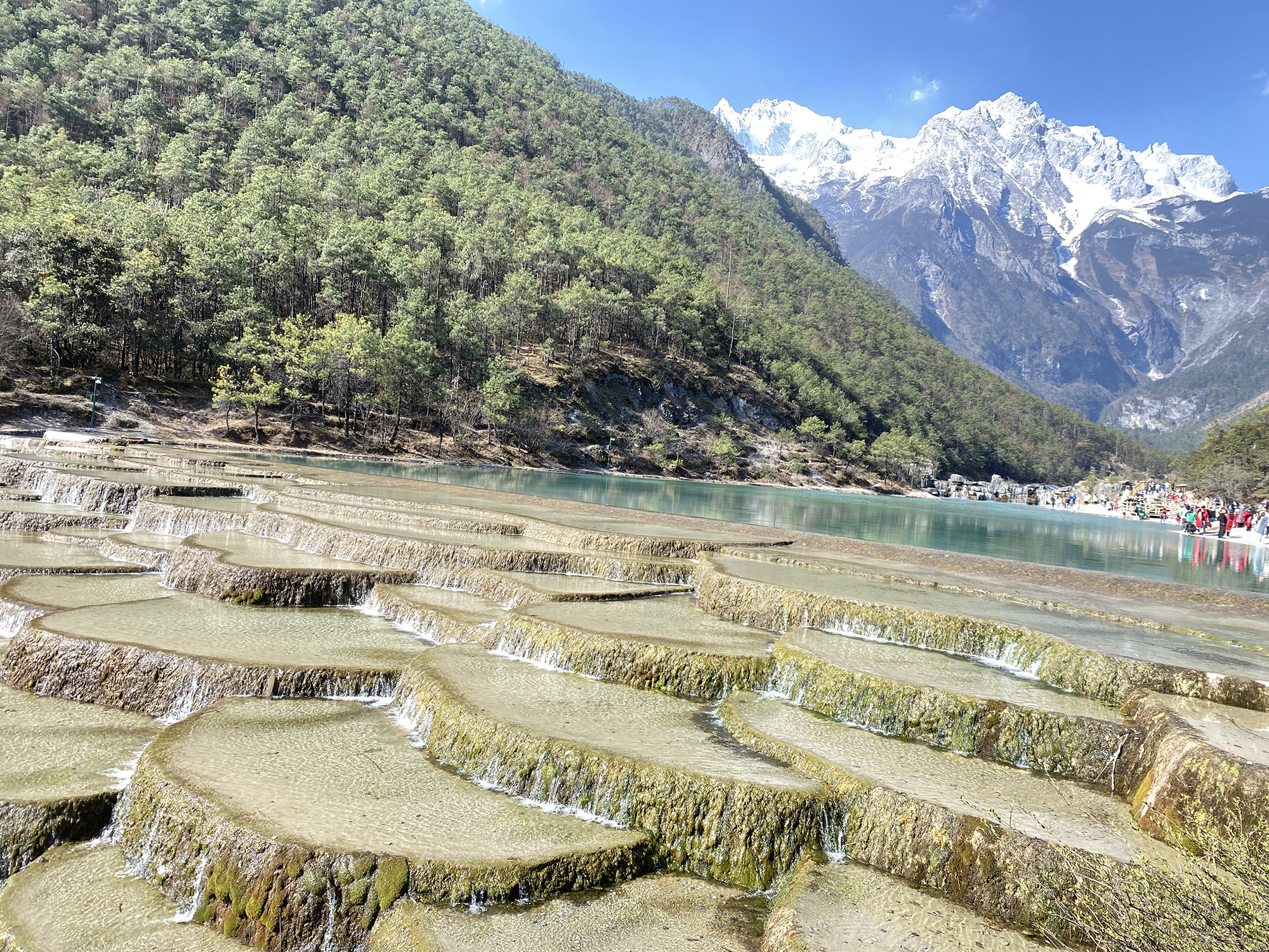 從玉龍雪山下來,我們迅速去往景區(qū)旅游大巴車的換乘站,去尋找玉龍雪山山神遺留在山腳下的藍寶石項鏈,人間秘境藍月谷。走進藍月谷內,玉液湖、鏡潭湖、藍月湖等數個大小不一的湛藍湖泊簇擁在一起,猶如一彎巨大的藍色月亮靜臥在玉龍雪山的懷抱之中,這樣的景色,美到令人心生敬畏。不遠處白雪皚皚的玉龍雪山倒影在澄澈的湖面上,周邊層林盡染,色彩如油畫一般,此時望著天上云卷云舒,頗有“半畝方塘一鑒開,天光云影共徘徊”的詩鏡。